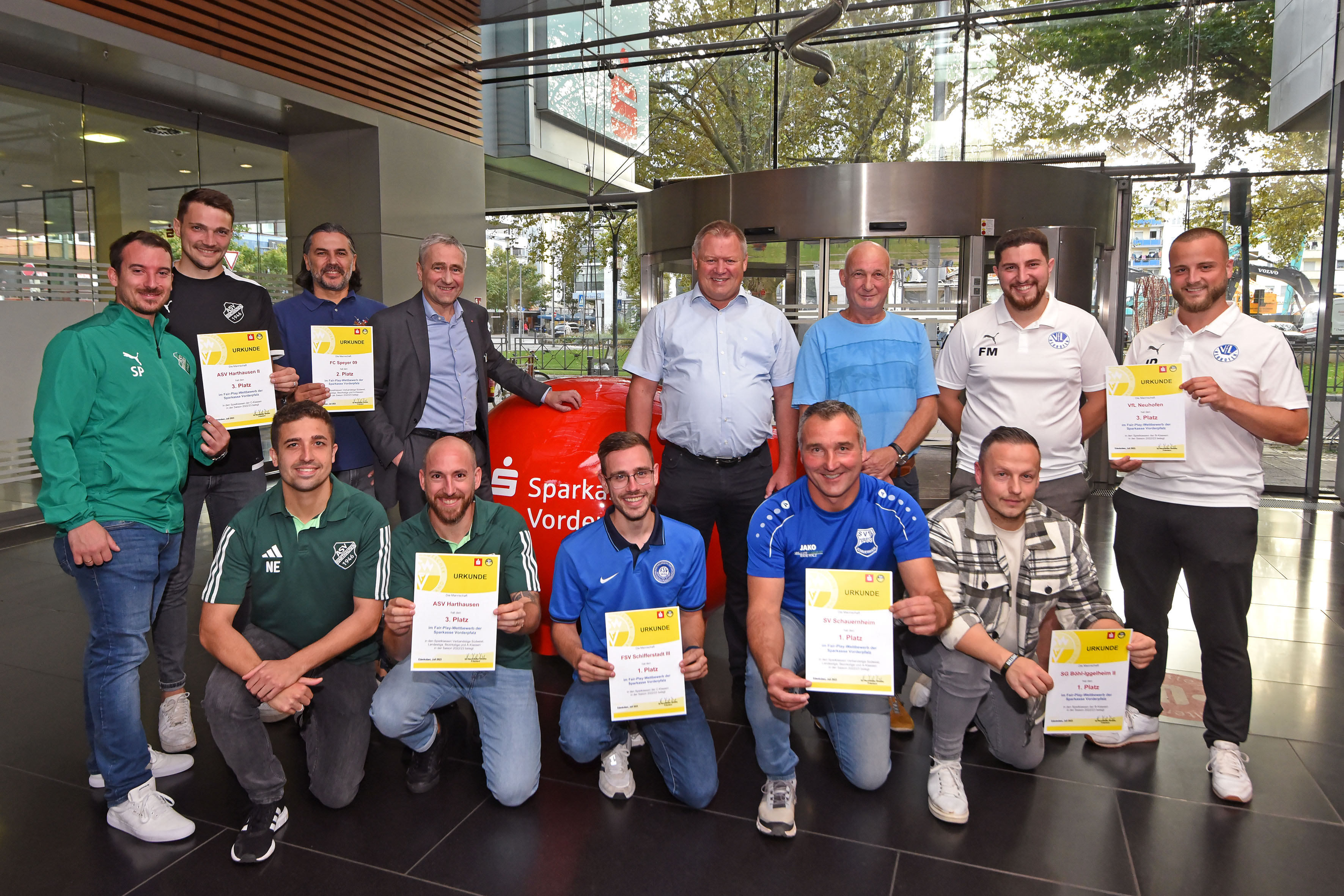 Ein Zeichen setzen für Fairness und Sportsgeist: Die Sparkasse Vorderpfalz honoriert die vorbildliche Spielweise der Fußballvereine in ihrem Geschäftsgebiet. Insgesamt 2.950 Euro an Geldprämien werden vergeben, um die fairsten Mannschaften der letzten Saison zu belohnen. Die Übergabe der Geldpreise erfolgte durch Thomas Traue, den Vorstandsvorsitzenden der Sparkasse Vorderpfalz, sowie die Kreisvorsitzenden des Südwestdeutschen Fußballverbands, Klaus Rings und Klaus Karl.