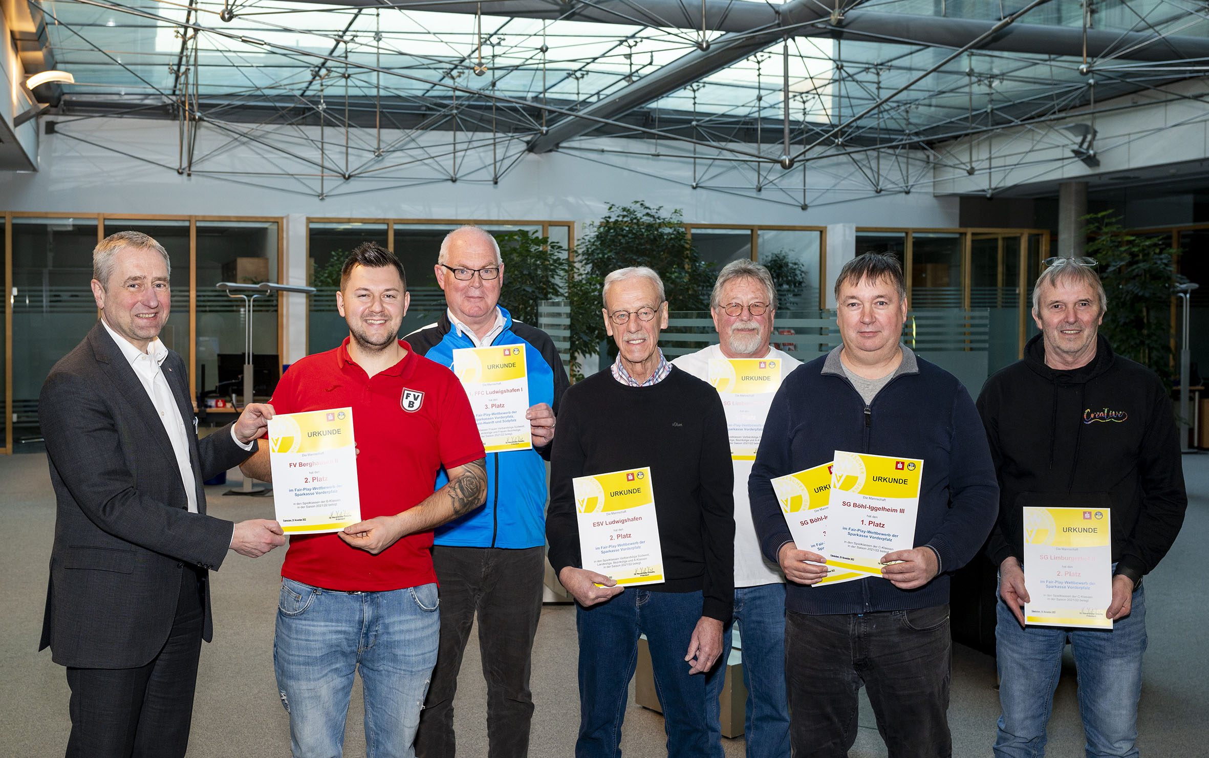 Bei den Männern aus der Verbands-Landes-Bezirksliga / A-Klasse erhält die SG 1919 Limburgerhof e.V. I 500 Euro (1. Platz), der ESV 1927 Ludwigshafen e.V. 250 Euro (2. Platz) sowie der ASV Maxdorf 1946 e.V. 150 Euro (3. Platz). Aus der Verbands-Landes-Bezirksliga / B-Klasse erhält der ASV Maxdorf 1946 e.V. II 500 Euro (1. Platz), der FV Berghausen 1920/46 e.V. II 250 Euro (2. Platz) und die SG 2022 Böhl-Iggelheim II 150 Euro (3. Platz). In der Verbands-Landes-Bezirksliga / C-Klasse erhält die SG 2022 Böhl-Iggelheim III 500 Euro (1. Platz), die SG 1919 Limburgerhof e.V. II 250 Euro (2. Platz) und die SpVgg RW Speyer 1921 e.V. 150 Euro (3. Platz). Beim Fair-Play-Wettbewerb der Frauen erreichten die Spielerinnen des 1. FFC Ludwigshafen e.V. I den 3. Platz und können sich über eine Prämie von 150 Euro freuen.