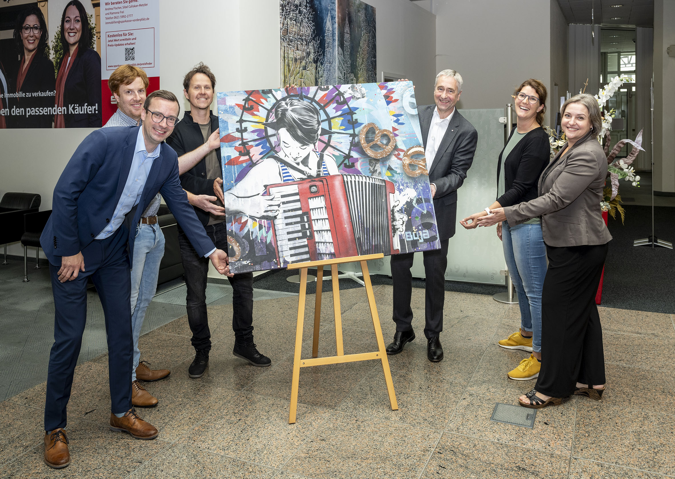 Round Table 63 Speyer überreicht das Brezelfest-Bild an die Sparkasse Vorderpfalz. Auf dem Bild v.l.n.r. Round Table Präsident Alexander Günther, Round Table Vizepräsident Jonas Becker, Künstler René Burjack, der Vorstandsvorsitzende der Sparkasse Vorderpfalz Thomas Traue, Inga Zimmermann vom Familientreff und Koordinatorin des Mikroprojektes Sabina Hecht.