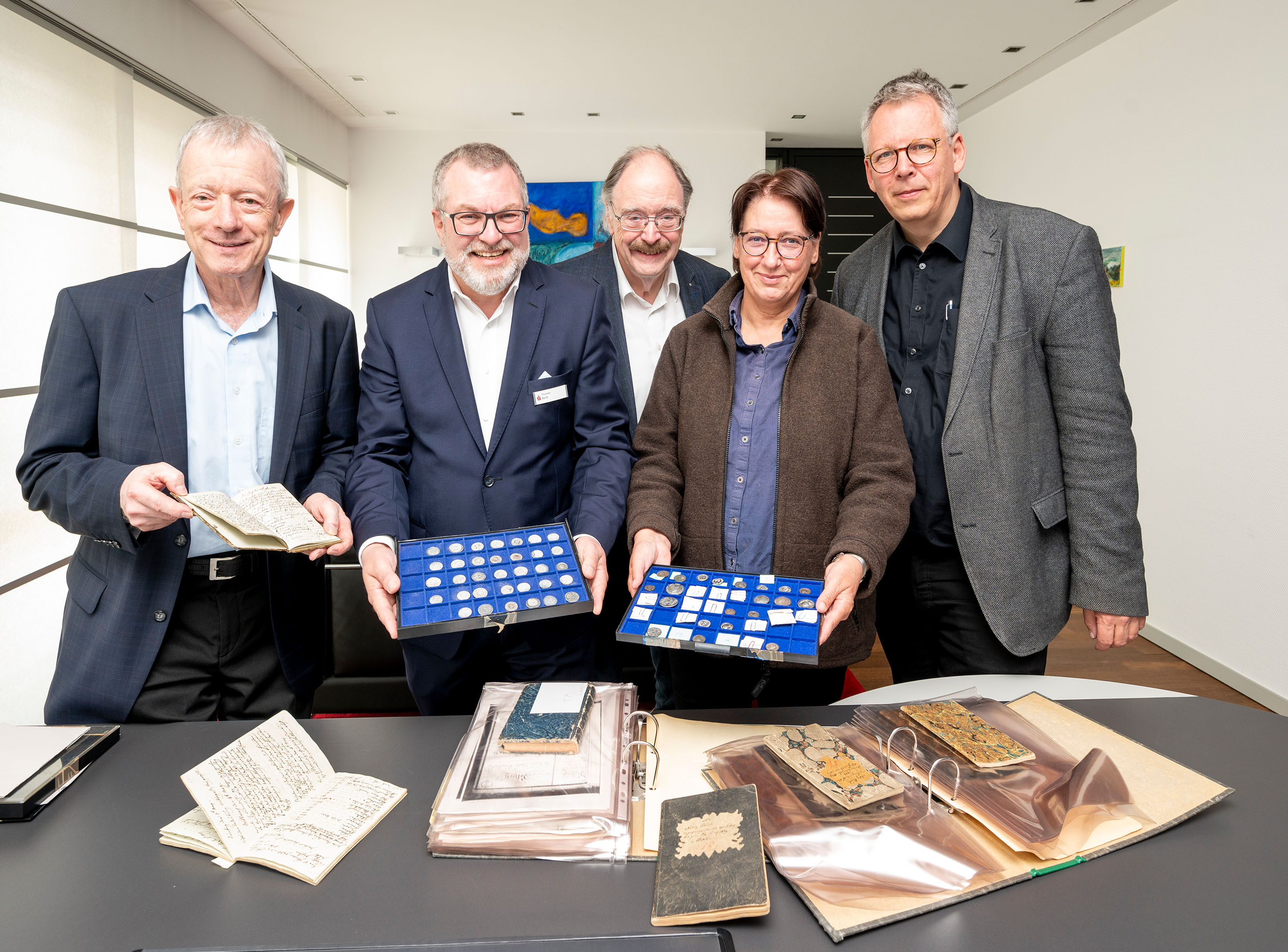 Im Beisein von Dr. Wolfgang Dreher (Vorsitzender der Numismatischen Gesellschaft Speyer, links), Dr. Rainer Albert (Ehrenvorsitzender der Numismatischen Gesellschaft Speyer, 3.v.r) und Andrea Gorys (Wissenschaftliche Mitarbeiterin des Münzkabinetts Staatliche Museen zu Berlin, 2.v.r) übergibt Thomas Reiß (Leiter Revision der Sparkasse Vorderpfalz, 2.v.l.) die Münzsammlung und Tagebücher des Münzfälschers Carl Wilhelm Becker an Prof. Dr. Bernhard Weisser (Direktor des Münzkabinetts Staatliche Museen zu Berlin, r.).