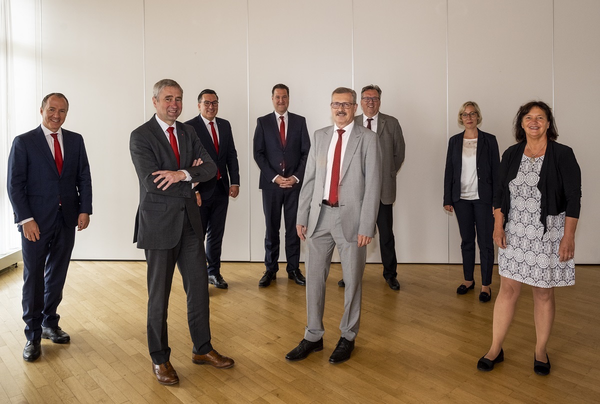 Foto: v.l.n.r.: Vorstandsmitglied Oliver Kolb, Vorstandsvorsitzender Thomas Traue, Vorstandsmitglied Ulli Sauer, Stephan Hartmann (Leiter UnternehmensCenter), Werner Kreger sowie aus dem Verwaltungsrat: Clemens Körner (stellvertretender Vorsitzender und Landrat des Rhein-Pfalz-Kreises), Stefanie Seiler (stellvertretende Vorsitzende und Oberbürgermeisterin der Stadt Speyer), Ilona Volk (Bürgermeisterin der Stadt Schifferstadt).